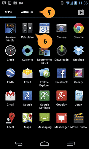 Внимание: вкладка «Виджеты» (5) отображается на экране приложений, коснитесь вкладки «Приложения».