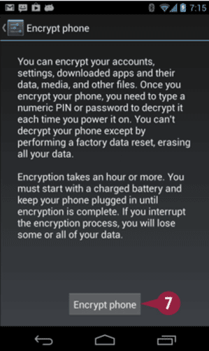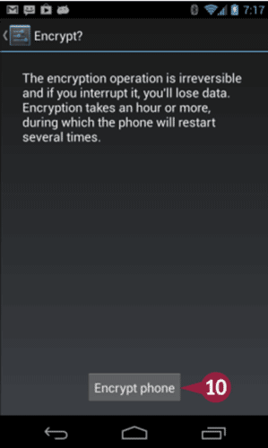 Прежде, чем зашифровывать свой телефон или планшет, следует полностью зарядить его батарею. К тому же во время шифрования телефон или планшет должны быть соединены с источником питания. Android требует, чтобы заряженная батарея и источник питания гарантировали завершение шифрования даже при внезапных перебоях в энергии.