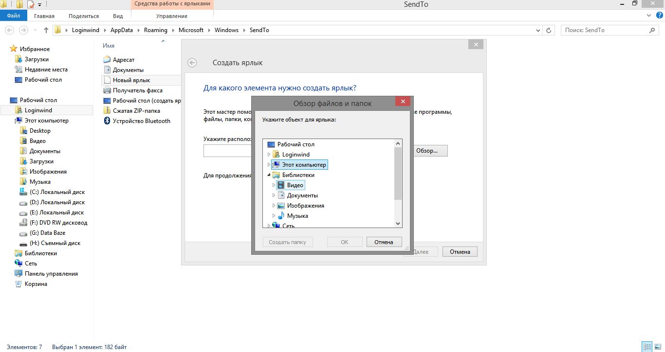 В открывшейся папке, нажмите правую кнопку мыши, вызвав контекстное меню проводника, и выберите "Создать" -> "Ярлык". В данном примере я создам ярлык для папки "Видео". Вы же выбирайте, что вам необходимо.