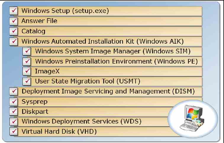 • System Preparation (Sysprep): Sysprep готовит образ Windows к формированию образа диска, системному тестированию или доставке потребителю. Sysprep можно использовать для удаления любых системно-специфических данных с образа Windows. После удаления из образа уникальной информации о системе, Вы можете взять этот образ Windows и использовать его для развертывания на множестве систем.