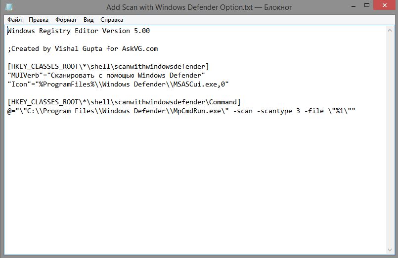 Все, что нужно для того, чтобы в контекстном меню появился пункт  «Сканировать Windows Defender» это создать текстовой файл с примерно следующим содержимым: