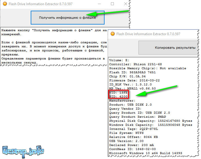 Простейший метод определения модели контроллёра носителя, PID, VID заключается в применении спецутилит. Лучшая из них - Flash Drive Information Extractor. Она являет собой небольшую и совершенно бесплатную утилиту, предназначенную для получения данных о флеш-накопителе.
