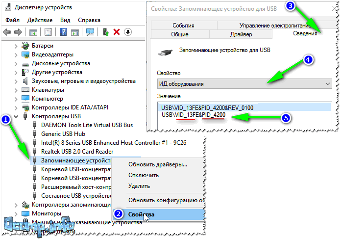 - Откройте «Сведения» и выберите «ИД оборудования». Вы увидите PID и VID носителя.