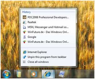 Первое, что обычно привлекает внимание пользователей после установки Windows 7 – это измененная панель задач, которая объединяет в себе, как часто используемые приложения, так и запущенные. Вместо текстовых описаний открытых окон, отображаются крупные значки – иконки запущенных приложений. Состав иконок размещаемых на панели задач каждый пользователь может настроить, как ему удобно. Главной функцией, которая значительно отличает панель задач в Windows 7 от предыдущих версий, являются – списки переходов (Jump list). Они есть у практически у каждого приложения, которое размещено на панели задач, вызвать его можно правым кликом кнопки мыши по нужной иконке. В списке переходов расположен список недавних и часто запускаемых файлов, перейти к которым можно прямо из списка, обходя все возможные каталоги и подкаталоги системы компьютера, и это очень удобно, т.к. значительно экономит время.