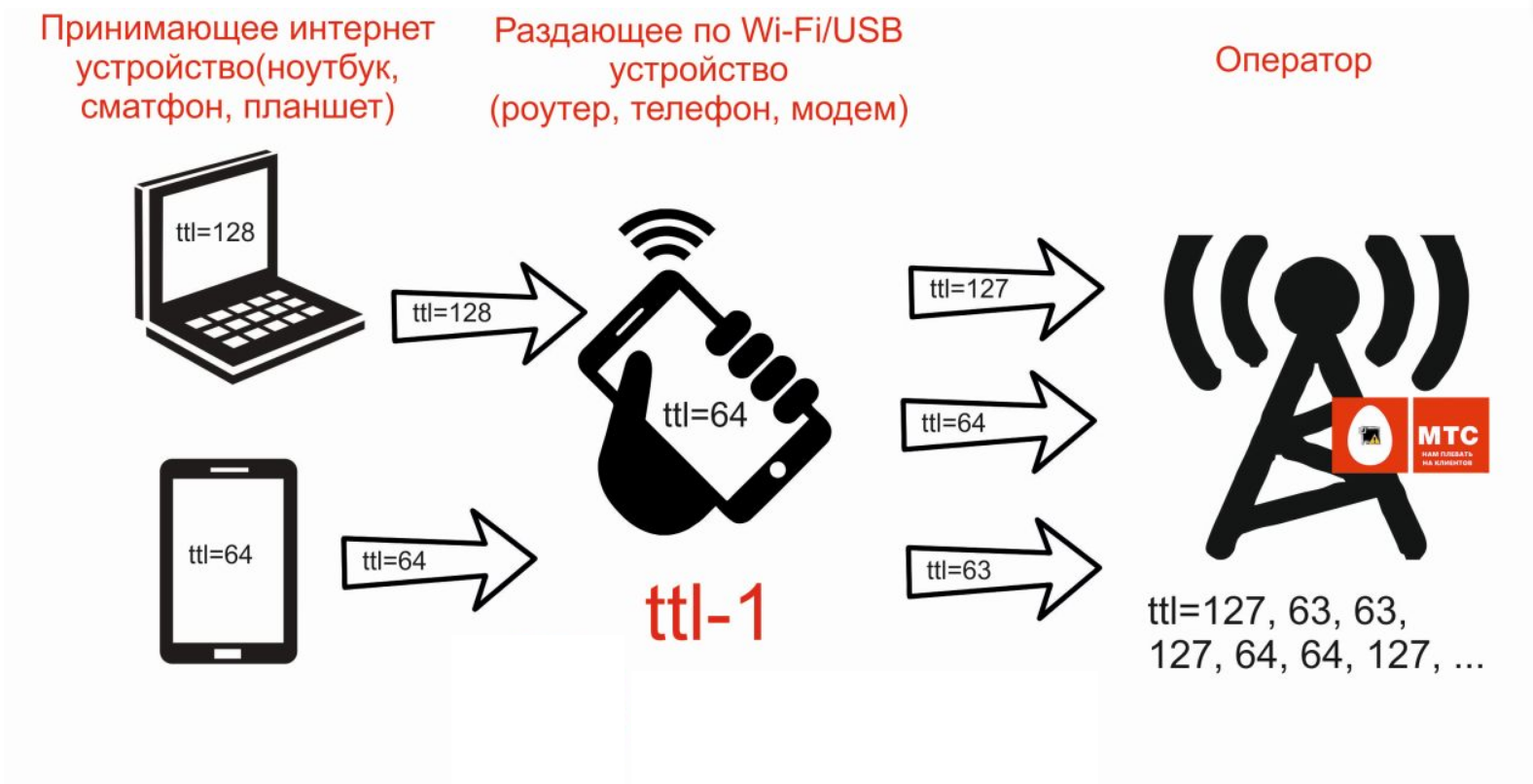3. Оператор сотовой связи анализирует данные TTL, исходящих от Вас и подмечает отличия. И когда Вы используете мобильное устройство как модем, оператор видит это, ибо сначала приходит TTL = 64, а потом TTL = 127 от компьютера.