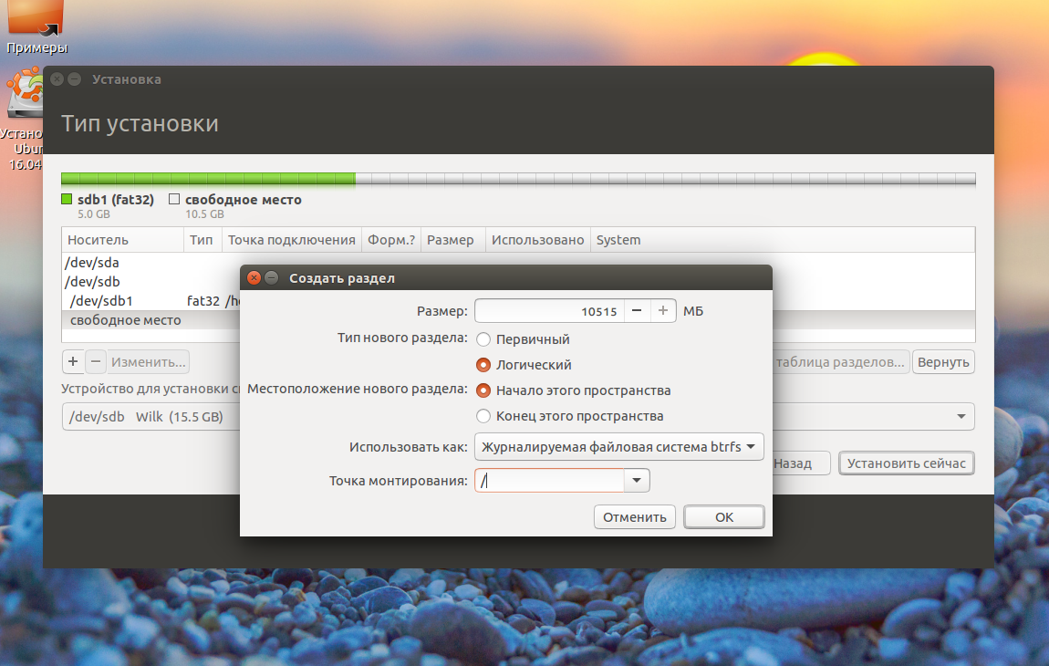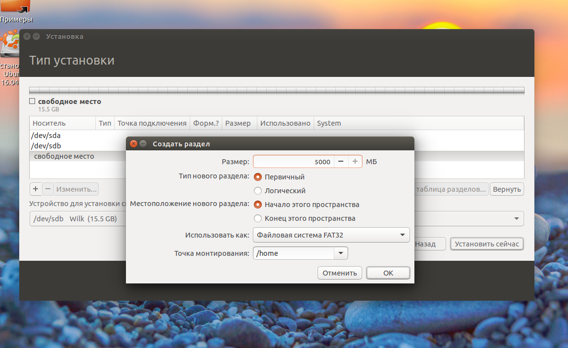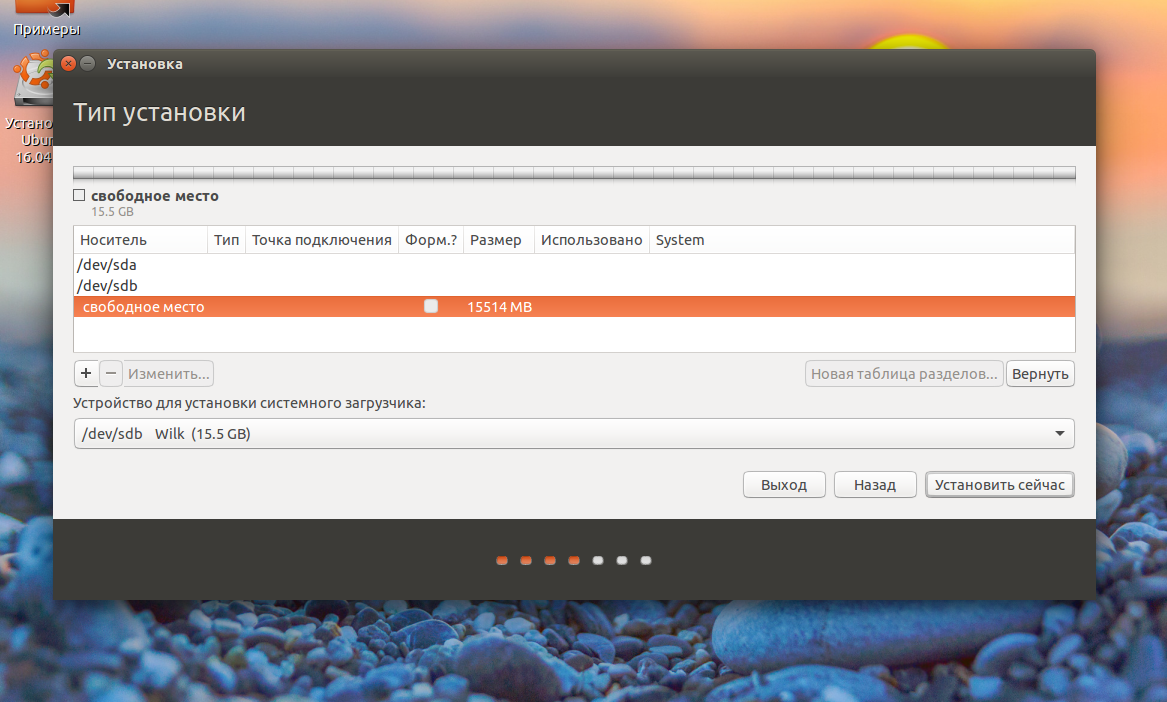 Система при этом не должна загружаться с того накопителя, на который вы собираетесь её установить. Ведь тогда установка Убунту на неё будет невозможной. При правильном осуществлении всех действий в окне разметки помимо /dev/sda появится флеш-накопитель /dev/sdb. Будет указан его размер, метка диска и он, скорее всего, будет иметь лишь 1 раздел. Для получения свободного места необходимо удалить данный раздел.