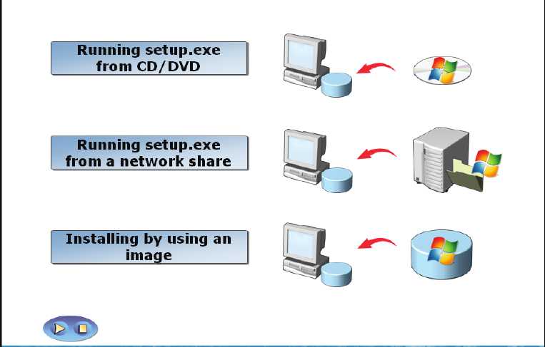 • Установка Windows 7 при использовании Образа: установите Windows 7 на компьютер и подготовьте его к дублированию. Получите полный объем образа, файл WIM, используя инструмент ImageX. Затем используйте инструменты развертывания, такие как ImageX, WDS, или MDT, чтобы развернуть полученный образ на другой компьютер.
