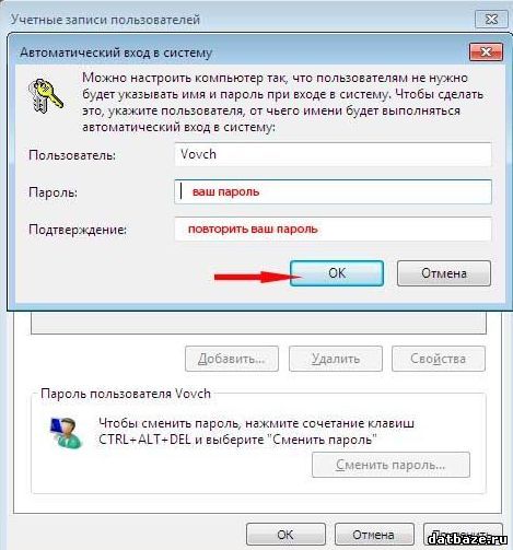 5. Откроется новое окно «Автоматитечкий вход в систему», в котором предлагается заполнить необходимые поля – «Пользователь», «Пароль» и «Подтверждение». Укажите свой пароль вписав его в поле Пароль и для подтверждения введите его еще раз - в поле Подтверждение.