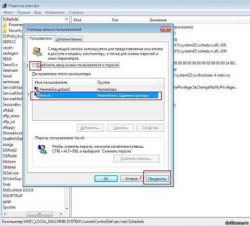 3. В новом открывшемся окне «Учетные записи пользователей», в разделе «Пользователи» выберите имя своей учетной записи. Как видно на рисунке у меня своя. Снимите галочку с пункта «Требовать ввод имени пользователя и пароля».