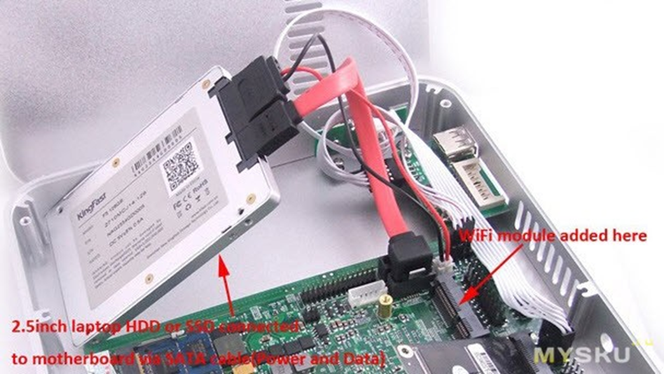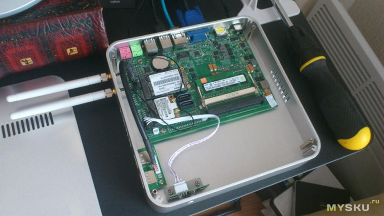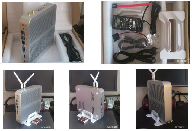 В комплекте с ПК идут кабеля (HDMI,  DATA - кабель и питание для SATA), 2 WI-Fi антенны, блок питания на 12В, 3А с евро-вилкой и подставка.
