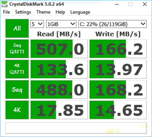 Проведенные мной тесты показали, что скорость чтения SDD – около 500 МБ/с, записи – 160 МБ/с, производительность на уровне процессоров Cоre i5-3317U, Cоre i7-4558U и AMD FX-8150, производительность графической системы немного превышает GеForcе 620.