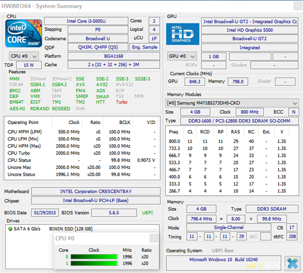 • Процессор: Intel Core i3 5005U (BroadWell 14nm) 2.0GHz Dual Core 4 Thread