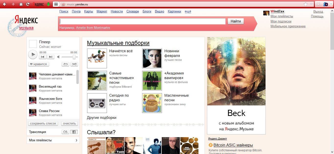 Зайти на Яндекс.Музыку можно, перейдя по ссылке расположенной под плеером — music.yandex.ru. В музыкальной базе Яндекс.Музыки можно найти не только российских, но и зарубежных исполнителей. На сегодня в его базе содержится около полутора миллионов треков и эта база постоянно увеличивается.