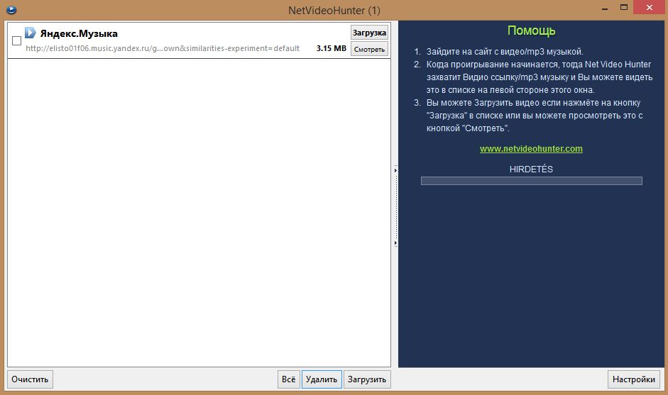 После скачивания и установки плагина, в браузере, в нижнем правом углу появляется значок дополнения. Когда начинается воспроизведение трека на Яндексе или вы начинаете просматривать видео на каком-нибудь сайте, значок начинает мигать, говоря о том, что файл перехвачен, и он готов его скачать. Кликните два раза по значку, откроется дополнительное окно NetVideoHunter Downloader. Справа от перехваченного файла нужно всего лишь нажать кнопку «Загрузка» и указать, куда сохранять, чтобы начать его скачивание на ваш компьютер.