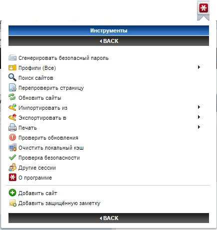 Щелкнув по параметру «инструменты» Вы откроете окно, в котором сможете сгенерировать безопасный пароль, добавить сайт или защищенную заметку. Хотя добавлять сайт в таком режиме мне еще не приходилось. Менеджер прекрасно справляется с этой задачей в автоматическом режиме.