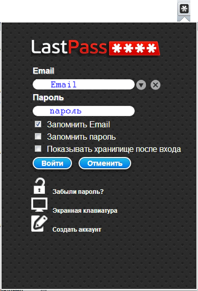 После установки расширения Вам будет предложено создать свой аккаунт и придумать для него основной пароль, так называемый Мастер-пароль. То есть Вам не придется запоминать все пароли для сайтов, достаточно запомнить пароль для входа в LastPass.