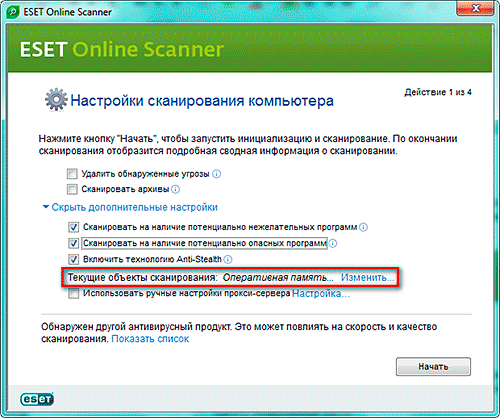 В запустившемся сканере, выставляем свои настройки. Я решил не удалять угрозы, а только обнаружить, мало ли что он надумает удалить. Объекты сканирования указываем свои. Нажимаем кнопку «Начать».