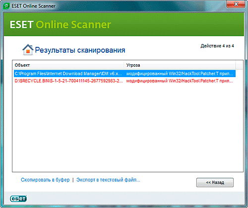 Посмотрим, какие угрозы обнаружил сканер. Первый файл - патч программы. Хорошо поставил в настройках проверку без удаления, а то остался бы без программы. Проверим второй файл антивирусом dr.Web. Антивирус этот файл не посчитал угрозой, значит от удаления файлов откажемся. Можно смело выходить из программы.