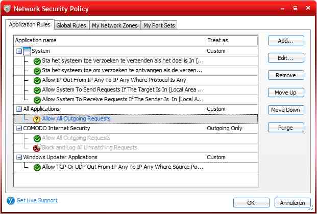 Согласно правилу приложения для "Всех приложений", все программы по умолчанию получают доступ к соединению Интернета/сети. Если Вы хотите иметь полный контроль над программами, получающими доступ к Интернету/сети, измените правило "Позволить все исходящие запросы", дважды щелкнув по правилу, и изменив действие с "Позволить" на "Спрашивать". Если процесс не сохранен в базе данных фаервола как безопасное приложение, в раскрывающемся окне пользователя спросят, позволить ли программе получить доступ к Интернету/сети (цвет раскрывающегося окна используется в качестве совета: оранжевый для надежного приложения и красный для неизвестного или опасной программы). Как только вы приняли решение, добавляется правило безопасности для процесса. Эти правила могут быть изменены, двойным щелчком по правилу безопасности. Другая опция должна удалить его из списка, вынуждающего firewall (в следующий раз, когда программа использует Интернет/сеть) показать запрос на действие.