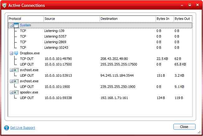 Активные соединения (вкладка "Брандмауэр", кнопка "Общие задачи", опция "Просмотр активных соединений") показывают краткий обзор приложений, которые в данный момент соединяются с Интернетом. Также там отображены порты и протоколы, используемые этими приложениями. По умолчанию фаервол блокирует весь входящий трафик. Что отключает необходимые для некоторых приложений порты. Брандмауэр также блокирует запросы для просмотра совместно используемых файлов другими компьютерами в сети. Опция Просмотр событий брандмауэра" показывает краткий обзор всех блокированных действий, что может быть полезным для решения проблем с брандмауэром.