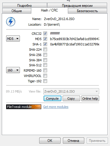 Осталось отметить нужные пункты галочками и нажать на кнопку "Compute". Через минуту-другую, расчет сумм будет сделан и отобразиться во вкладке. Если эти символы совпадают с символами в описании на сайте, файл скачан без ошибок.