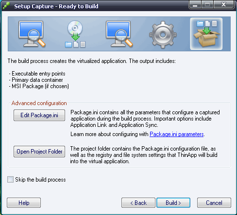 После того, как ThinApp сделает второй снимок системы (Postscan) откроется последнее перед сборкой окно Ready to Build, в котором есть кнопка Edit Package.ini, кликнув по которой можно открыть готовый к редактированию файл песочницы.