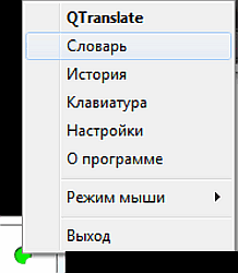 После запуска программы на панели задач появляется черный/зеленый круг – иконка QTranslate. Клик по ней правой кнопкой вызовет меню программы. Верхняя позиция "QTranslate" – открыть/закрыть основное окно перевода. Позиция "Словарь" – вызывает окно словаря. "История" – история переводов. "Клавиатура" – вызов виртуальной клавиатуры.