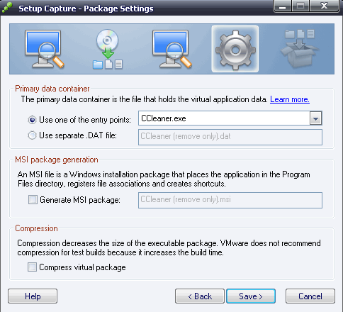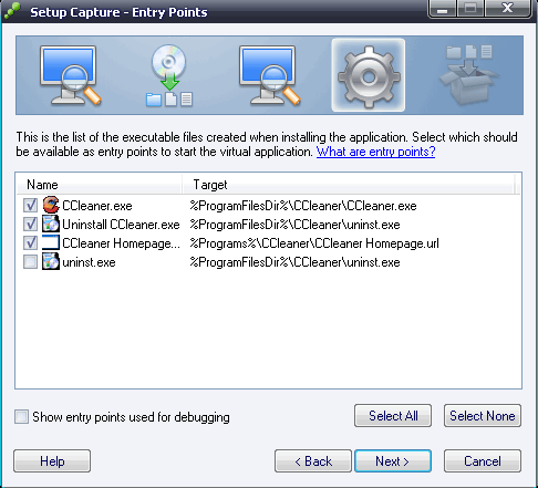 в котором ThinApp предложит выбрать точки входа, то есть выбрать тот exe - файл, который станет файлом запуска. В нашем случае Ccleaner.exe. На других точках галочку убираем. Если в программе имеется несколько файлов запуска для отдельных её приложений, отмечаем все нужные.