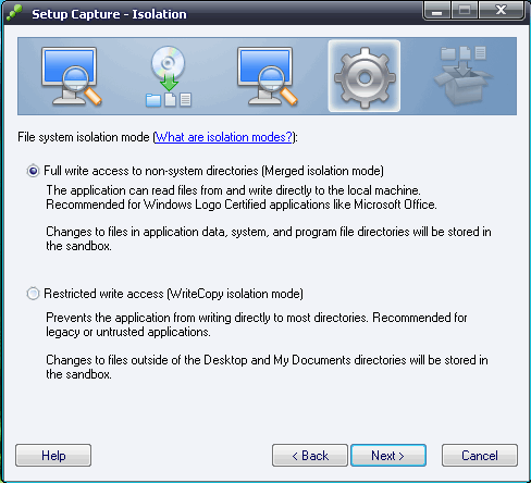 Merged (full write access to non-system directories) – система полностью доступна для портабельной сборки. Если системные и виртуальные элементы совпадают, то сборка видит виртуал. Изменения в виртуале попадают в песочницу, остальные изменения и новые элементы окажутся в реальной системе.