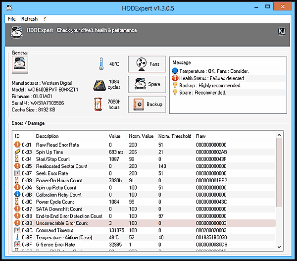Рядом с этим показаниям, вы найдете три кнопки с надписями " Fans", "Spare" и "Backup". Первые две кнопки перекинут Вас на страницу результатов поиска Amazon, которая содержит рекомендуемые продукты, такие как сменные части жесткого диска и вентиляторы. Кнопка Backup ссылается на программу "Backup & Recovery 12 Home", которую можно установить и использовать для создания резервной копии данных ваших дисков. В разделе "Message", рядом с этими кнопками, утилита отображает свой вердикт о состоянии ваших дисков и рекомендации для предотвращения (Spare) или защите (Backup) от сбоев.