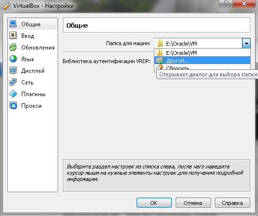 В открывшемся окне, слева в меню выберите пункт "Общие". Здесь нужно указать где будет располагаться виртуальный жесткий диск. По умолчанию он располагается на диске C:. Если хотите, чтобы диск находился в другом месте. то укажите путь к папке, выбрав в "Папка для машин" правильное место для размещения. "Библиотека аутентификации VRDP:" ничего менять не нужно.