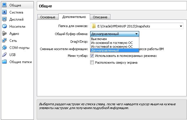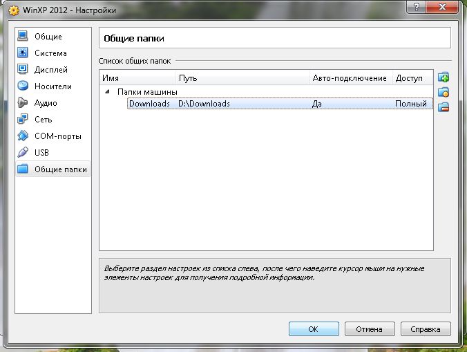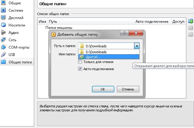 И последний пункт меню "Общие папки". Здесь вы можете добавлять или удалять общие папки для реальной и гостевой ОС. Они подключаются в виртуальной машине в виде сетевого диска, так что при подключении сразу же установите галочку в пункт "Авто-подключение". И также можете выбрать, как папка будет работать с файлами в этом сетевом диске, с полным доступом к управлению или "Только для чтения".