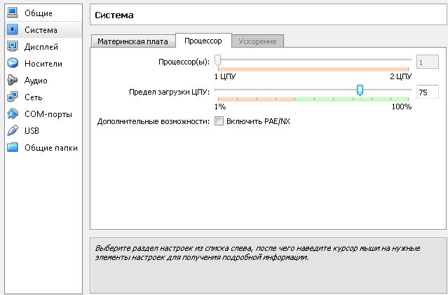 Во вкладке "Процессор" указывается сколько процессоров доступно и сколько будет задействовано в виртуальной машине. Если вы устанавливаете ОС 32(86), то должен быть 1 процессор, если же 64, то 2 процессора и больше, все зависит от возможностей вашего компьютера.