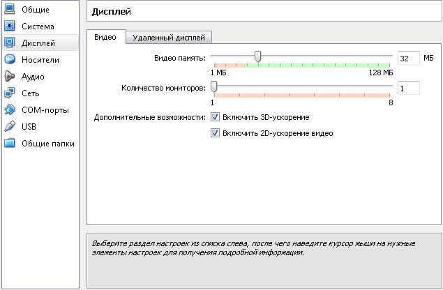 Пункт меню "Дисплей", вкладка "Видео" - здесь устанавливается графический размер памяти для видео карты виртуальной машины. Сколько устанавливать решать вам. Если вы собираетесь играть в ней в серьезные игры, то конечно графика должна быть высокой.