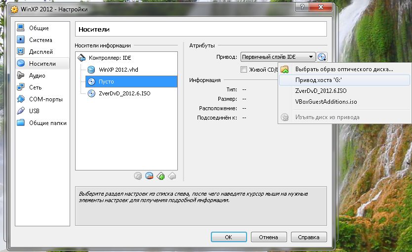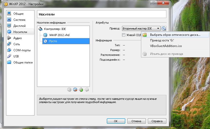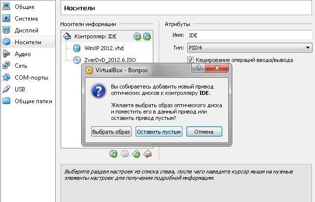 Во внутреннем окне "Носители информации" выберите "контроллер IDE", появятся два значка для добавления дисков, жесткого и CD/DVD или виртуального.