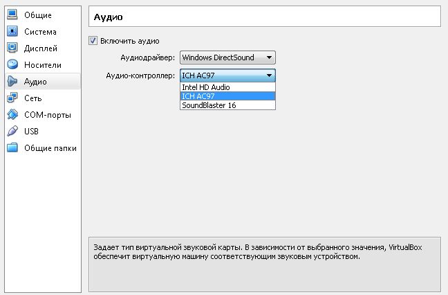 Пункт меню "Аудио". Рабочие настройки всегда уже установлены по умолчанию, но если вы хотите их изменить, задействовать другое звуковое устройство присутствующее на вашем компьютере или совсем выключить звук, сделайте соответствующие установки.