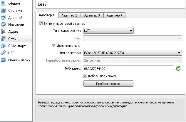 Следующий пункт "Сеть". В последних версиях VirtualBox все настройки взаимодействия с сетевой картой уже настроены по умолчанию и вполне работоспособны, в отличие от первых версий программы, где все приходилось настраивать вручную предварительно облазив весь интернет в поисках подсказки.