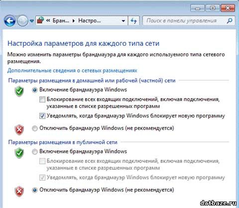 Щелкнув по ссылке «Изменение параметров уведомления» или «Включение и отключение брандмауэра Windows» вы откроете окно настройки параметров.