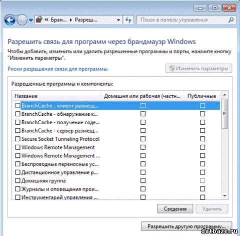Выберите нужный компонент и установите разрешающую галочку в каждом профиле. Если вы хотите добавить в список конкретную программу, нажмите на кнопку «Разрешить другую программу».