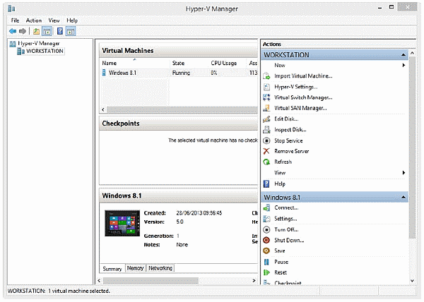Вероятно, самая знаменитая функция в Windows 8.1, после нового UI, программное обеспечение виртуализации Microsoft Hyper-V. Выпущенный еще в 2008 году как часть ОС Windows Server, этот - инструмент виртуализации, позволяет выполнение других ОС более ранних версий Windows и GNU/Linux в основном установленном узле Windows 8.1.