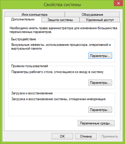 Вкладка "Дополнительно", этого диалогового окна, содержит три раздела: "Быстродействие", "Профили пользователей" и "Загрузка и восстановление".