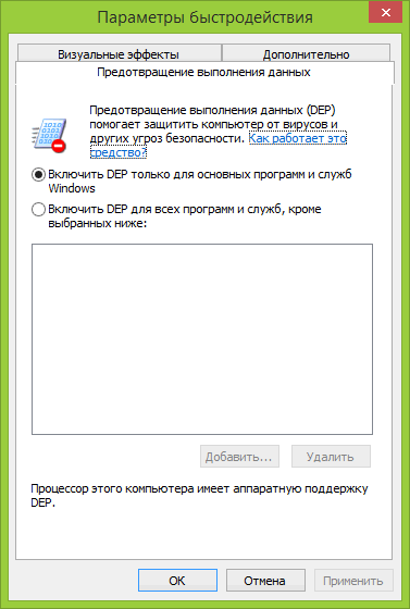 Параметр предотвращения выполнения данных (DEP), который можно открыть в диалоговом окне быстродействия - функция, препятствующая повреждению вашей установки Windows, определенными вирусами и вредоносным программным обеспечением. А также, здесь можно запретить запуск определенных игр или другого программного обеспечения.
