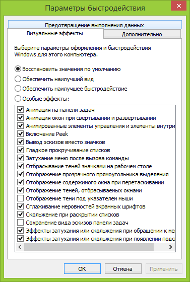 Чтобы перейти в раздел быстродействия, нажмите кнопку параметров. Первая, в открывшемся окне, вкладка - визуальные эффекты, где вы можете управлять способами вывода на экран рабочего стола Windows 8.1. Часть изменений, которые вы здесь можете сделать, чисто косметические. Например, некоторые люди считают, что при отсутствии теней под окнами, рабочий стол выглядит более чистым.