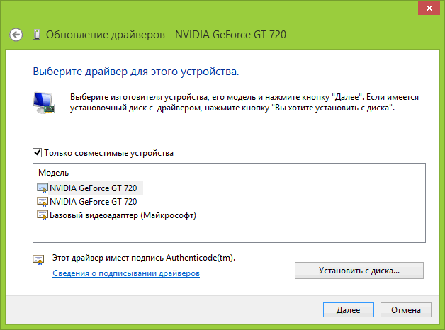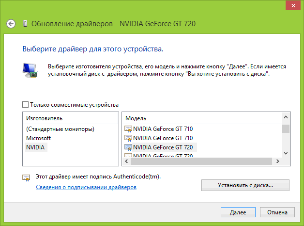 Если в списке своих аппаратных средств вы не видите, уберите отметку с поля "Показать совместимые аппаратные средства". Перед вами откроется длинный список аппаратных средств от различных производителей. Это - драйверы, которые поставляются с Windows 8.1, и, если в этом списке вы свои аппаратные средства нашли, выберите производителя и название продукта, соответствующее аппаратным средствам, которые вы пытаетесь установить.