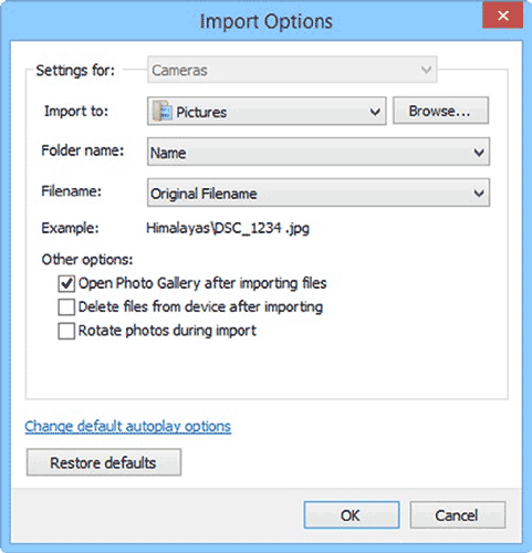 Щелчок по ссылке "Дополнительные опции", на любой из страниц импорта, дает возможность изменить место хранения для импортированных элементов, и обработку в пакетном режиме – переименование импортированных элементов и автоматический поворот фотографий. Если Вы хотите, после импорта, Windows 8.1 может удалить эти элементы из устройства или карты памяти.