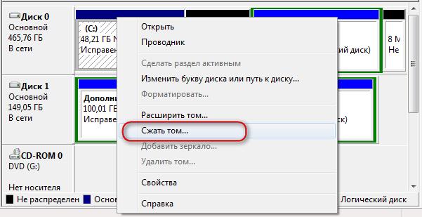 Раздел Windows можно быстро, легко и относительно безопасно изменить, используя инструмент "Управление дисками". "Пуск" -> "Компьютер" -> правой кнопкой "Управление" -> "Управление дисками". Щелкните правой кнопкой по разделу, который будет изменен и выберите "Сжать том". Появится окно, где вы увидите максимально возможный для этого раздела результат. Установите требуемый новый размер раздела и нажмите "Сжать".