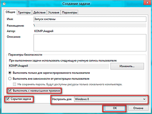 В поле «Имя», вкладка общие, прописать название задачи, например «Запуск системы». Поставить галки в полях «Выполнить с наивысшими правами» и «Скрытая задача». В поле «Настроить для:» отметить Windows 8. Для кого выполнять задачу выбрать по своей конфигурации.