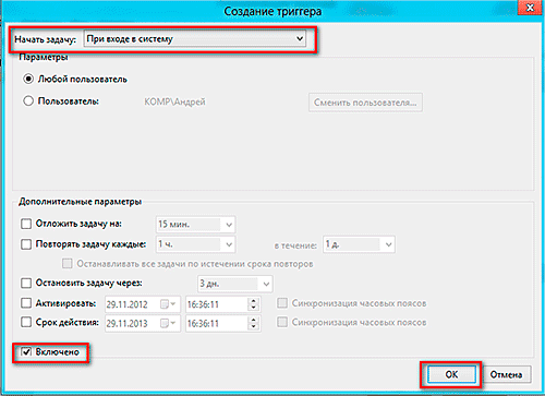 Во вкладке «Триггер» нажать кнопку «Создать» чем вызвать «Мастера». В открывшемся окне «Создание триггера» в поле «Начать задачу» отметить «При входе в систему» и оставив галку на строке «Включено» завершить работу мастера кнопкой «Ок».
