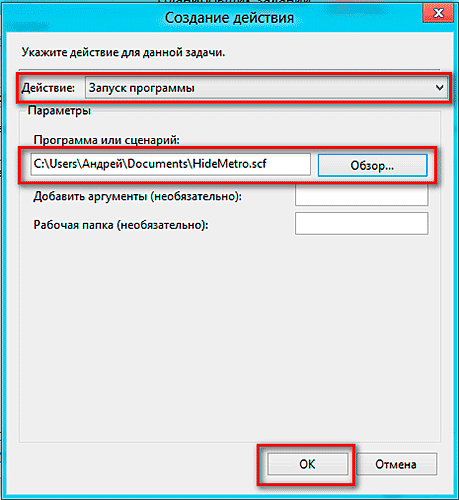 Во вкладке «Действия», кнопка «Создать» в открывшемся окне «Создание действия» указать путь к файлу HideMetro.scf и согласиться с действием нажав на кнопку «Ок».