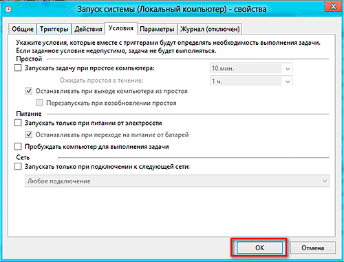 Во вкладке «Условия» убрать все галки. Кнопка «Ок».